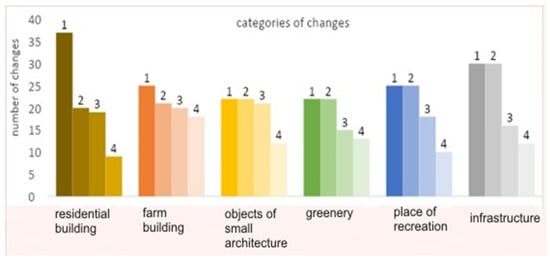 Number and distribution of changes within surveyed farms by category. Legend: residential building: 1—number of changes made, 2—installations (heating system), 3—roof renovation, 4—new building). farm building: 1—number of changes made, 2—building extension, 3—renovations, 4—building conversion; objects of small architecture: 1—number of changes made, 2—new construction, 3—renovation of old, 4—reconstruction. greenery: 1—number of changes made, 2—new planting, 3—maintenance of existing, 4—greenery restoration. place of recreation: 1—number of changes made, 2—grill/fireplace, 3—playground; 4—renovation of existing; infrastructure: 1—number of changes made, 2—demarcation of a car park, 3—surfacing the car park, 4—installation of lighting.