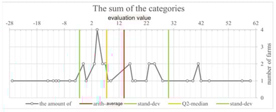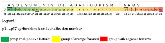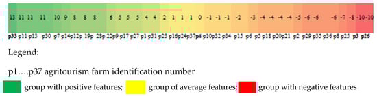 Within each category, a score was given to each research unit (farm) and then added up. The different categories were analyzed for differences in scores between test subjects. This combination made it possible to divide the studied units into groups with positive, average and negative characteristics. Within a given group, it was possible to carry out an analysis comparing farms with each other and to identify those which had similar characteristics. By summing up the categories, it was possible to distinguish farms with similar characteristics and identify objects for further case study research. Agritourism farms were subjected to a parameterization. The result was an individual category value and an aggregate score (Figure 5).