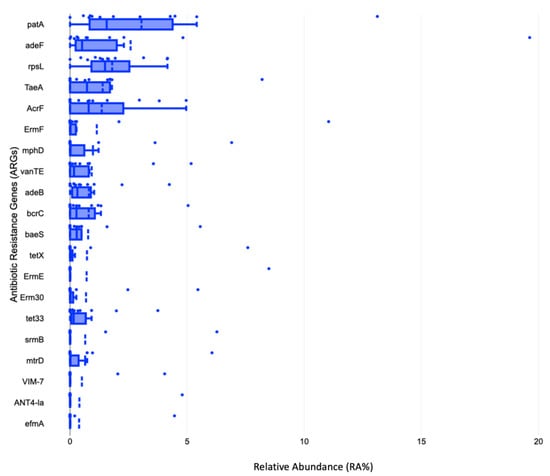 Relative abundance (RA%) of predominant ARGs in the marine sediments of Kuwait’s coast. For each ARG, a box-and-whisker plot is shown. Each box represents the interquartile range (25–75%), upper and lower whiskers are −10–90%, and dashed blue lines mean RA%. The blue dots denote the RA at 12 sampling points. The x-axis shows the relative abundance, and the corresponding ARGs are plotted on the y-axis.