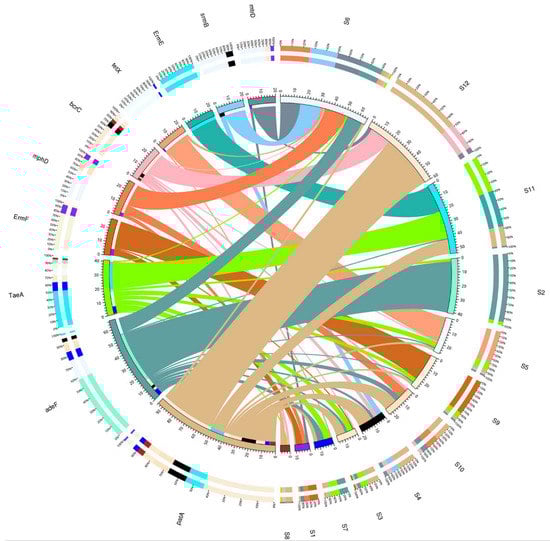 The RA and dominance of these genes varied at each site (Figure 3). The genes mtrD, patA, ErmF, and mphD were predominant at S1. At S2, adeF and TaeA were more common. The sampling site of S3 harbored more of patA, TaeA, bcrC, ErmF, and adeF. The abundant ARGs at S4 were patA, srmB, bcrC, and adeF. Genes such as tetX, TaeA, patA, bcrC, and adeF were prevalent at S5. The genes mphD, srmB, mtrD, adeF, tetX, adeF, patA, and TaeA were commonly found at S6. The site S7 exhibited the domination of adeF, TaeA, patA, and tetX. S8 showed a prevalence of patA, bcrC, and TaeA. S9 was richer in ErmF, TaeA, patA, and adeF. Site S10 was a reservoir of patA, mphD, adeF, and bcrC. The site S11 more commonly housed TaeA, adeF, patA, and ErmE genes. The relatively pristine site of S12 also possessed ARGs such as patA, bcrC, and mtrD.