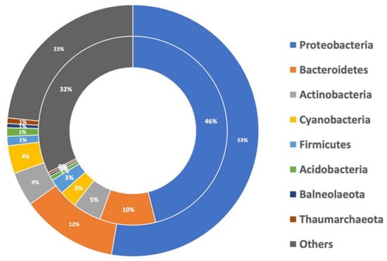 Double-doughnut chart representing the major phyla hosting the resistance genes in the marine sediments. The outer circle shows the distribution of phyla associated with all the bacterial genes, whereas the inner circle illustrates the dominant phyla bearing the ARGs.
