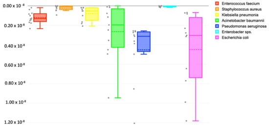 The Enterococcus faecium, Staphylococcus aureus, Klebsiella pneumonia, Acinetobacter baumanii, Pseudomonas aeruginosa, Enterobacter sps., and Escherichia coli (ESKAPEE) pathogens, known for their multidrug-resistant nature, were also detected in the collected samples (Figure 5). Their relative abundances were very low (>0.01%). The highest average abundances were recorded for E. coli, followed by P. aeruginosa > A. baumanii > E. faecium, > K. pneumonia, S. aureus, and Enterobacter sps.