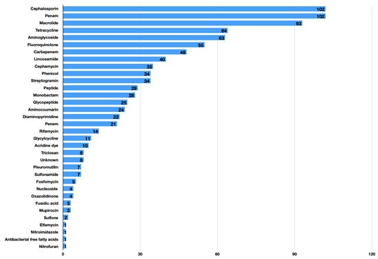 We observed that the genes were active against 34 drug classes. The majority were resistant to the beta-lactams, cephalosporins (102), and penam (102). In addition, ARGs resistant to tetracycline (93), aminoglycoside (63), fluoroquinolone (55), carbapenem (48), lincosamide (40), cephamycin (35), phenicol (34), streptogramin (34), peptide antibiotics (29), and monobactum (28) were also recorded (Figure 6). A total of 25 or fewer ARGs were resistant to the drug classes of the glycopeptide, aminocoumarin, diaminopyrimidine, penem, rifamycin, glycylcycline, acridine dye, triclosan, pleuromutilin, sulfonamide, fosfomycin, nucleoside antibiotic, oxazolidinone, fusidic acid, mupirocin, sulfone, elfamycin, nitroimidazole, antibacterial free fatty acid antibiotics, and nitrofuran. There were eight ARGs not assigned to specific drug classes (unknown). Further investigations to identify these cryptic drug classes are highly recommended. Approximately 42% of the ARGs were resistant against two or more drug classes.