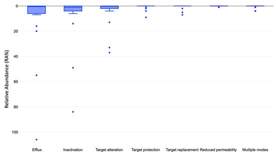 Modes of action of ARGs discovered in marine sediments from Kuwaiti shores. Each box represents the interquartile range (25–75%), upper and lower whiskers are −10–90%, and dashed blue lines mean RA%.