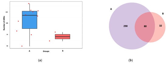 We compared the distribution of ARGs between Group A (S1, S2, S3, S5, S6, S7, S8, S9, S10, and S11) and Group B (S4 and S12). Group A comprised locations that were near the outfalls, whereas Group B included the pristine and clean sampling areas. An average of 120 ARGs were observed in Group A, which was almost 1.7 times higher than in Group B (mean: 70) (Figure 8a). Analysis of unique and common ARGs revealed that approximately 80 genes were common between both groups. Group A possessed 290 unique ARGs, while 32 were included in Group B (Figure 8b). We believe the higher numbers of genes in Group A were due to higher exposure of these microbes to dissolved antibiotics discharged through the outfalls than in Group B, which were cleaner sites. The hierarchical clustering also revealed that the prevalence of ARGs differed spatially (Figure 8c). The hierarchical clustering also revealed that ARGs were spatially different (Figure 8c). The prevalence of ARGs varied at each site within the same group. Metastats revealed vanHF to be significantly different between Group A and Group B (q < 0.05).