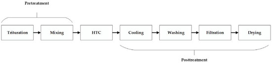Hydrochar is produced through hydrothermal carbonization (HTC), a thermochemical treatment that transforms lignocellulosic biomass into carbon-rich products with multiple applications [3,4,5]. The process is carried out by immersing the biomass in water inside a closed reactor; the biomass-to-water ratio can range from 1:6 to 1:12 since water serves as the reaction medium. In addition, it is necessary to purge any oxygen that could be left inside the reactor; this is typically achieved by circulating nitrogen inside the reactor; the absence of oxygen is crucial so that the reaction intermediates are not oxidized and can follow the pathways leading to the formation of the final products. As for the operating parameters, this process occurs at relatively low temperatures, in the range of 180–350 °C, and under self-generated pressure conditions for times ranging from a few minutes to several hours [6,7,8], at these conditions, the water is in subcritical conditions and its properties as a solvent are improved and acts as a catalyst [9].