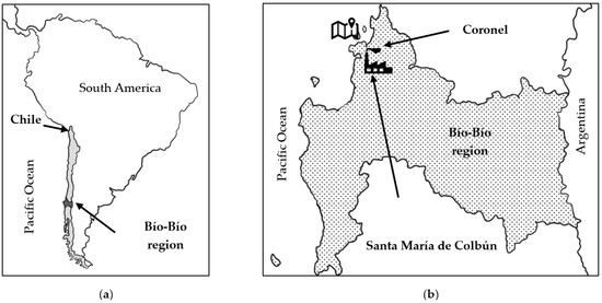 Location of the thermal power plant. (a) Location respect to South America; (b) Location of Santa María de Colbún in the south of Coronel, Bío-Bío region, Chile.