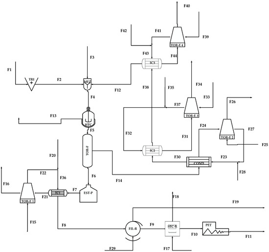 Based on the block diagram in Section 2.4, the flowsheet (Figure 3) was designed in which the different one or multiple units will be found working in parallel; such is the reactor case.