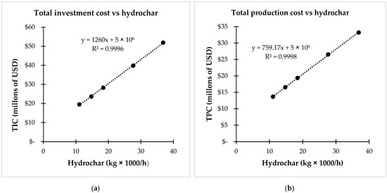 The NPV of the 5 cases is expected to exhibit a similar behavior considering that it depends directly on total investment and production costs, which is evidenced in Figure 5. The first graph (a) in this figure shows such expected behavior. However, the second graph (b) shows how IRR behaves compared to hydrochar production, which does not exhibit linear performance. This is interesting given that it is possible to choose which case is more convenient only based on which case provides a more significant increase in the IRR.