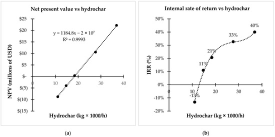 Graphs. (a) Net present value and hydrochar graph; (b) internal rate of return and hydrochar graph.