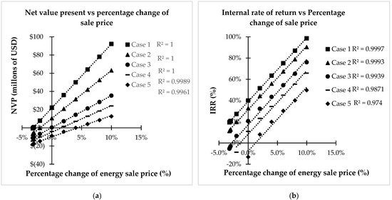 Similar results were found in the sensitivity analysis regarding the energy sale price. However, this time both the NPV and IRR showed a linear behavior, as shown in Figure 6.