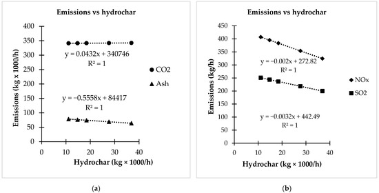 Emissions vs hydrochar graphs. (a) Emissions of CO2 and ashes. (b) Emissions of NOx and SO2.