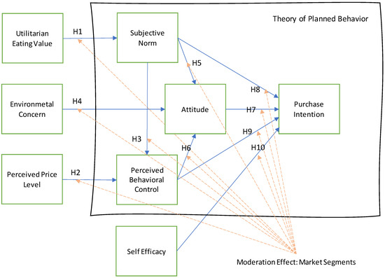Based on the literature review, this research established ten hypotheses and proposed the following conceptual framework. We also proposed that the market segments of green food play a moderation effect in this structural model. The model examined the relationships among factors such as utilitarian eating value, environmental concern, perceived price, subjective norm, perceived behavioral control, self-efficacy, attitude, and purchase intention linked with consumer buying behavior and marketing segmentation of green foods based on the theory of planned behavior. A solid blue line shows the effect of one factor on another factor. A dashed orange line shows the effect of market segments on a factor.