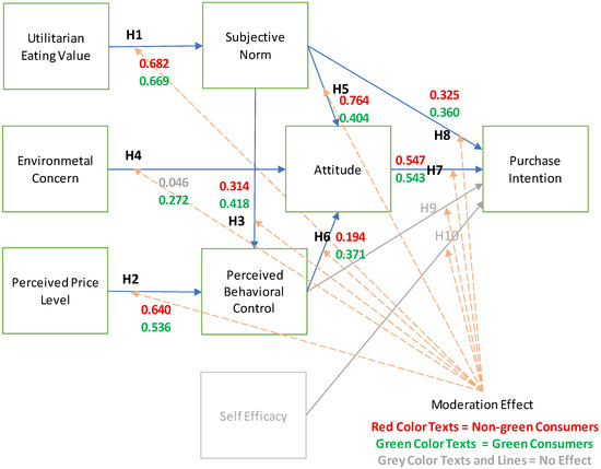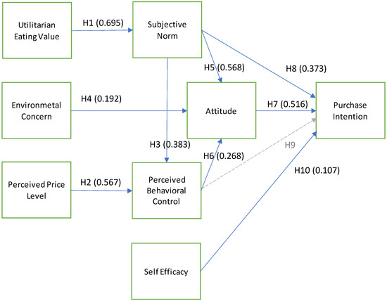 According to Table 6 and Figure 2, the structural model’s test results supported H1 to H8 and H10 at the significant level of 0.001 or less, whereas H9 was not supported. The relationships among the constructs were highly significant in statistics. The researchers established the analysis by considering the following constructs: utilitarian eating value, perceived price, subjective norm, environmental concern, perceived behavioral control, attitude, self-efficacy, and purchase intention adapted to the theory of planned behavior [17,23]. H1 was supported first, indicating that the utilitarian eating value had positive influences on subjective norms with a standardized factor loading of 0.695.