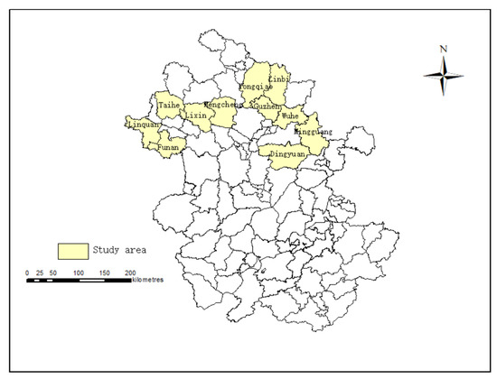 We select 11 counties whose grain output ranks in the forefront of Anhui Province, China as the sample counties. The 11 major grain-producing counties are Funan, Linquan and Taihe in Fuyang City, Guzhen and Wuhe in Bengbu City, Lixin and Mengcheng in Bozhou City, Yongqiao and Lingbi in Suzhou City, Mingguang and Dingyuan in Chuzhou City. Figure 2 displays the locations of these counties.