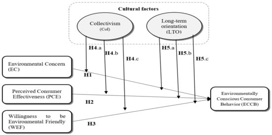 Accordingly, this study is among the few studies that investigate the direct relationship between behavior and its predictors without the mediation of intention. More precisely, to the best of our knowledge, it is the first study to test the direct effect of environmental concern and willingness to be environmentally friendly, as substitutes for attitudes, and perceived consumer effectiveness, as substitutes for perceived behavioral control on ECCB [1,34]. Moreover, this study is among the rare attempts to extend the TPB through the examination of the moderating role of cultural factors (collectivism, long-term orientation) in the relationships between behavior and its predictors. The choice of collectivism and long-term orientation as moderators can be explained by the fact that they are considered by several studies to be among the most accepted moderators that have a crucial impact on consumer behavior towards eco-friendly products [35,36]. Furthermore, regarding the impact of long-term orientation on ECCB, it seems interesting to study it as environmental consciousness requires a long-term view of our planet [5].