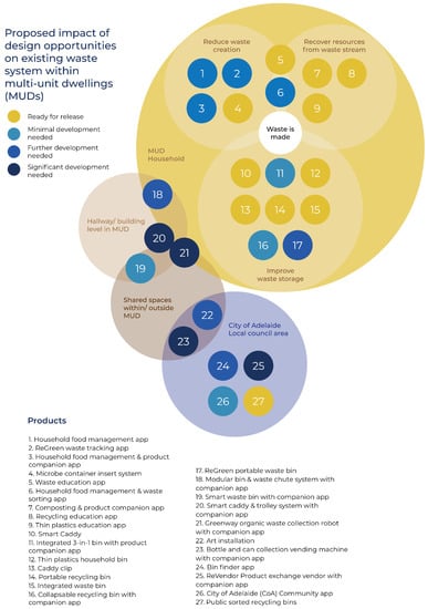 Figure 5, 27 standalone products were proposed in response to the CoA’s challenge of improving resource recovery in MUDs, across several aspects and contexts within the waste system. As is shown, a large quantity of concepts is focussed within the household, targeting three priority areas: 1. reducing the creation of waste, 2. improving the recovery of reusable resources from the current waste stream and finally 3. improving the storage of waste in the household to increase the success of areas 1 and 2. Additionally, several products also engaged surrounding areas including the shared spaces within an MUD, the hallways and recreational spaces, and addressed challenges unique to particular MUDs such as student housing. Finally, four concepts also presented opportunities outside of an MUD building to engage the local community and wider council area in the conversation and engagement in better waste management practices.