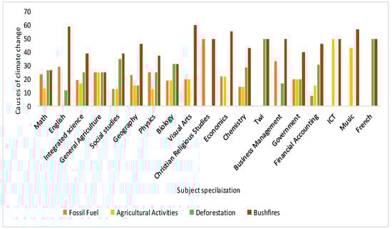 The survey also evaluated respondents’ knowledge of the causative nexus of climate change based on the subject they work with. The syllabi of the disciplines they teach, such as Information, Communication, and Technology (ICT), Music, and French, did not include reasons for climate change such as the burning of fossil fuels and deforestation, according to respondents. Respondents who work with languages (English, Twi, and French), Business Management, and Financial Accounting were also unaware that expanding agricultural activities are a big driver of climate change, according to the findings (Figure 3). Even though deforestation is a major contributor to climate change, respondents in the Visual Arts, Christian Religious Studies, Economics, Information Technology, and Music did not concur. Surprisingly, 100% of the respondents agreed that bushfires are a major contributor to climate change. This finding is consistent with a study by [33], which indicated that climate change education is more directly associated with learning outcomes in science, whereas it is given less weight in the arts, accounting, and language curricula.