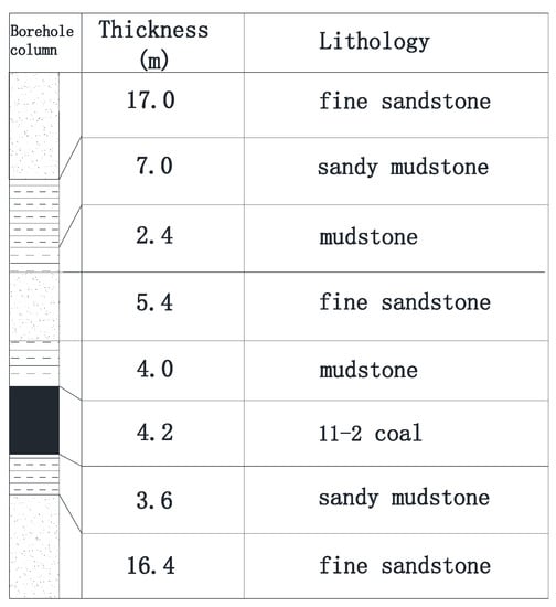 We selected the soft rock layer of the roadway roof in Liuzhuang coal mine as the research target to study the characteristics of zonal damage and the mechanism of long anchorage zonal linkage technology. The stratigraphic column obtained from the 11-2 coal seam is shown in Figure 1, and the coal seam’s average buried depth and thickness are 615 m and 4.2 m, respectively. The lithology of the roadway roof from bottom to up is mainly mudstone and fine sandstone with the thickness of 4 m and 5.4 m, respectively. The roadway floor is composed of sandy mudstone (3.6 m) and fine sandstone (16.4 m). The dip of this coal seam is nearly flat, with a dip of 3°.
