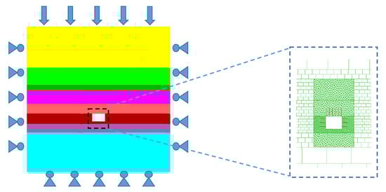 A two-dimensional numerical simulation model was constructed with the calibrated parameters for simulating the roadway excavation and fracture evolution. The length of the model is 60 m in both the horizontal and vertical directions. The width and height of the roadway section are 5.4 m and 3.2 m, respectively, as is shown in Figure 3.