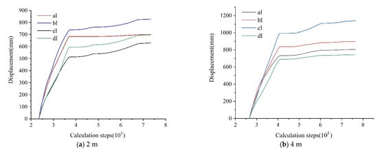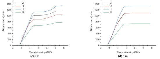 With the growth of the model’s time step, the displacement of the various parts of the roadway surface continued to grow. Thicknesses of 2 m, 4 m, 6 m, and 8 m of the soft layer of the roof displacement reached 631 mm, 1141 mm, 1339 mm, and 1331 mm after the roadway excavation, and the floor displacement was 697.3 mm, 743.9 mm, 775.8 mm, and 733.1 mm. With the increase of the thickness of the soft layer, the deformation of the roof also increases. The comparison graph of the displacement curve of different thicknesses of the soft layer is shown in Figure 6.