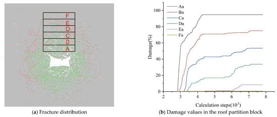 The damage ratio in both areas was counted respectively, where Aa and Ba represent the damage values in each area. After the roadway excavation, the roof damage was a continuous cumulative process, and the final damage amount in area A reached nearly 95%. With the time step running on, stress caused by the excavation of the roadway was transferred to the 1–2 m range of the roadway roof, area B, which caused the rock in this range to be loaded and form fissures. The rock formed a certain range of damage, and the final damage amount was 60%. Compared with zone A, the amount of damage in zone B was significantly reduced, indicating that the rock mass in the higher strata is more stable than that in the shallow place.