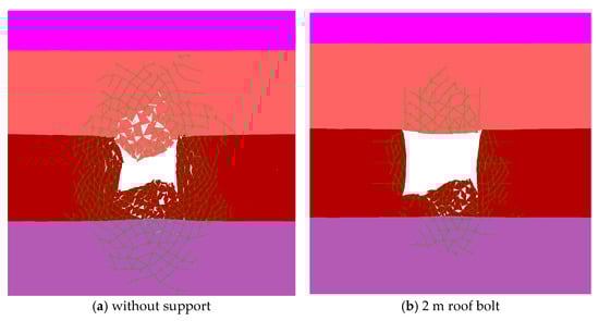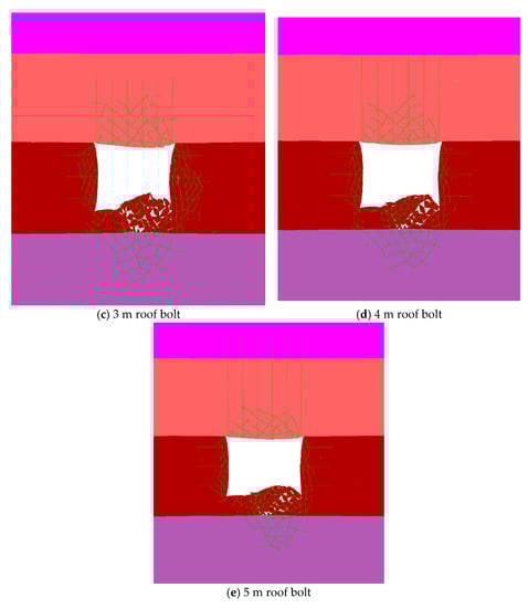 With the variation in bolt length, the evolution of the fracture is displayed in Figure 10. In the simulation, after giving timely support to the roadway surrounding rock and applying different length bolts, it can be seen from Figure 10b that the bolts play a significant role in inhibiting the development and expansion of fractures in the roof. The voids between detached blocks decrease. Moreover, the fracture development boundary shrinks inward in the scope height and width. With the length of bolts increasing, the fracture development scope has a decreasing trend. The installation of 2 m bolts in the roof can prohibit the fracture evolution to an extent. However, the end of the short bolts cannot anchor in a stable and less fractured area, which will easily lose the anchorage fundament due to stress disturbance. Therefore, extending the anchorage length and creating a thick and stable anchorage zone is important to maintaining roof stability.