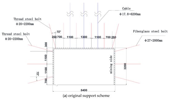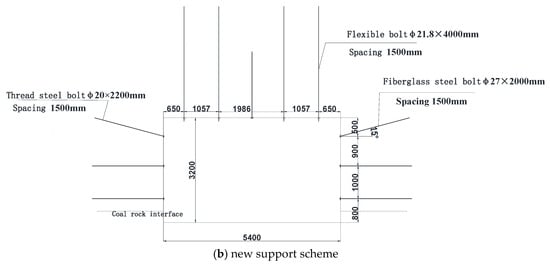 The selected roadway is in the Hulusu mine. The coal seam depth at the working face is large, about 670 m; the coal seam thickness varies greatly, from 1.87 m to 3.55 m, with an average of 2.71 m. The lithology of the research site is shown in Figure 13. Under the original support plan, the fissures observed onsite reach outside the short bolts anchorage range, threatening roof stability. A revised support plan with 4m bolts length focusing on roof control was proposed and implemented in practice, taking into account the short bolts anchorage range and maximum crack development range. The cross-section of the targeted roadway is rectangular: 5.4 m in width and 3.2 m in height. The major support parameters are plotted in Figure 14.