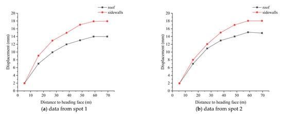 From the displacement data observed from spots 1 and 2, the deformation of the roadway surrounding rock was plotted in Figure 18, which gained a good control with the support scheme changing in practice. Finally, the roof deformation of spots 1 and 2 reached 13 mm and 14 mm, respectively, whereas the sidewall convergence of spots 1 and 2 reached 18 mm. The supporting effect was ideal and met the expected requirements.