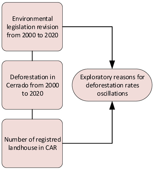 The methodological steps followed, showed in Figure 1, started with a review of the main milestones of environmental legislation from 2000 to 2020. Then, based on deforestation data from Cerrado [24], the main regulatory frameworks were superimposed on the timeline along with the trajectory of deforestation. The objective of this approach is to study, in an exploratory way, how the stronger presence of the State, through the creation of laws and regulatory agencies, can influence the decline in deforestation rates.