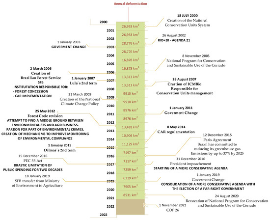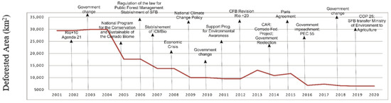 To further relate the Cerrado deforestation rates with the main legislative and contextual frameworks associated with the environment, it is necessary to construct the trajectory of these political frameworks from 2000, period which initiated the monitoring deforestation by INPE in the Cerrado. In Figure 2 a timeline is presented with the main political frameworks of the period and the amount of observed deforestation in Cerrado.