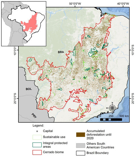 - Inpe—Instituto Nacional de Pesquisas Espaciais. Coordenação Geral de Observação da Terra. Prodes-Incremento Anual de Área Desmatada no Cerrado Brasil. 2021. Available online: http://www.obt.inpe.br/cerrado (accessed on 26 June 2022).
