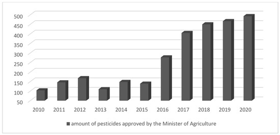 As a way of illustrating this influence, since 2016, was observed a rise in the amount of the number of type of pesticides approved by the Ministry of Agriculture, increasing 104 in 2010 to 493 in 2020 (Figure 4).