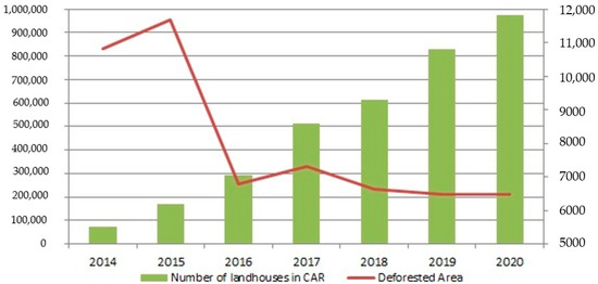 The comparative analysis between the number of landhouses registered in the CAR year by year and the deforested area, shown in Figure 9, shows that there is a trend that the increase in the adhesion to the CAR is related to the decrease of deforestation in the Cerrado. Pearson’s correlation coefficient between the deforested area and the number of rural properties registered in the CAR has a moderate negative correlation; r(10) = −0.81, p = 0.025854. Such a has already been identified in deforestation studies in the Brazilian Amazon [45,46].