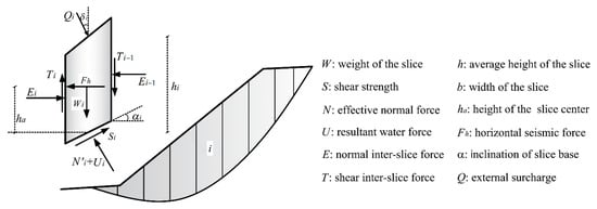 Morgenstern and Price [] established a holistic and robust approach for the general form of failure surfaces that fulfils both the force and the moment equilibrium. In order to accept the dynamic load inside the pseudo-static assessment, each slice’s center receives an equivalent force (Fh) in the horizontal direction, which can be computed by the following equation: