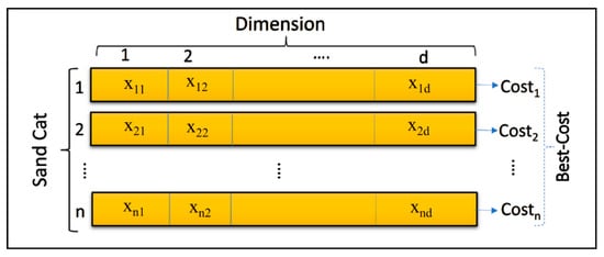 Each sand cat in the SCO algorithm represents a problem variable. To begin the SCO method, the candidate matrix of the sand cat population is generated randomly between the lower and higher limits of design variables. The dimension of the candidate matrix for a d-dimensional optimization space with n sand cats is equal to Npop × Nd, (pop = 1, …, n), as shown in Figure 2.