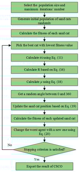 Proposing novel optimization strategies to solve real-world issues, as evidenced by the literature analysis, is highly desirable. The sand cat optimization (SCO) approach is a newly created bioinspired meta-heuristic optimization strategy inspired by the search and hunting behavior of the sand cat. It was first suggested by Seyyedabbasi and Kiani []. The low-frequency noise detection behavior of sand cats to find prey was the subject of the sand cat algorithm development []. The SCO outperforms other competitive methods in terms of identifying optimal solutions and is well suited to real-world optimization challenges. The chaotic sand cat optimization (CSCO) is an improved variant of the original SCO introduced in this study that uses chaotic sequences to enhance the algorithm’s searching and exploration capabilities.