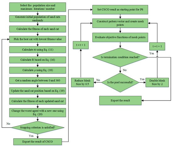 The global optimum performance of chaotic sand cat optimization (CSCO) is excellent, and it is easy to get out of local minima. The CSCO can increase the precision of the results by raising the number of iterations. However, CSCO seems unable to enhance the precision of the findings when the number of epochs is sufficiently high. Consequently, CSCO’s local investigation power remains poor. The starting point significantly affects the results of the pattern search algorithm, which uses a local optimization methodology and different initial points resulting in significant differences in the outcomes. However, even so, pattern search will be a quick and efficient tactic if a great starting point is selected. In this study, we successfully combined the benefits of CSCO as a global optimization and pattern search as a local optimization to identify the best answer. Because the PS is dependent on the first solution, the suggested hybrid method starts with the CSCO. The CSCO is used to keep searching for a certain number of iterations. The PS is then enabled to perform a local search utilizing the CSCO’s best solution as an initial point. Figure 5 shows the process flow of the suggested hybrid algorithm.