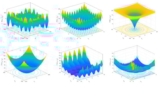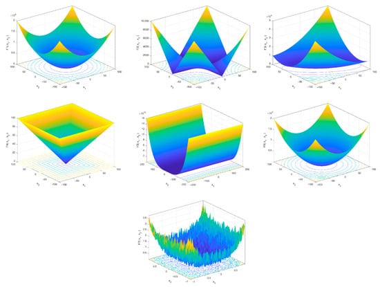 In this section, we recount how a set of numerical reference test functions was used to compare and confirm the effectiveness of the proposed chaotic sand cat–pattern search algorithm (CSCPS). In the empirical-evidence literature, these functions are commonly used to determine the performance of optimization algorithms [,]. The mathematical model and characteristics of these test functions are shown in Table 2 and Table 3. This standard set is divided into two categories: the exploitation ability of an algorithm was examined by using unimodal functions with a single global best; and the multi-modal functions were examined with multiple local minimums for testing an algorithm’s capability for exploring and avoiding local optima. MATLAB R2020b (Natick, MA, USA) was used to create the suggested algorithms. All of these functions should be minimized. Furthermore, all functions have a dimension of 30. Three-dimensional drawings of these benchmark functions are illustrated in Figure 6 and Figure 7.