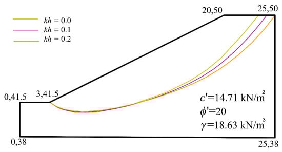 Slope failure is a common cause of fatalities and property damage. As a result, geotechnical engineers must determine the minimal slope safety factor and find the critical slip surface [,]. In general, slope safety testing is performed while the slope is subjected to static loads. In an earthquake-prone area, the stability assessment of a slope exposed to dynamic loads should be thoroughly investigated. Various methods, such as finite element analysis, limit equilibrium, limit analysis method, probabilistic analysis methods, and others, have been developed for this analysis. However, limit equilibrium is the most widely used analytical approach for geotechnical studies []. These methods function by slicing the entire slide slope mass into a fixed number of vertical slices and evaluating the probable slip surfaces and their associated safety factors in terms of various active forces. In the limit equilibrium approach, the slope’s stability is determined by the lowest factor of safety (FOS) connected to the major failure surface. For seismic slope safety analysis, the pseudo-static technique is the most popular process. This concept has been used in limit equilibrium methods, in which an equivalent static force (Fh) can be used to predict the outcome of an earthquake. The horizontal acceleration coefficient (Kh) and projected sliding mass weight determine the magnitude of this force [].