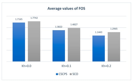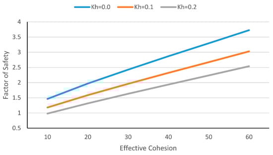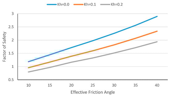 In addition, in this section, we recount how a sensitivity analysis was carried out by using the proposed methodology in order to determine the impact of the horizontal acceleration coefficient and soil characteristics, such as effective friction angle, effective cohesion, and unit weight, on the minimum factor of safety (FOS) for earth slopes. To this aim, the first case study presented in Section 5.1 underwent a sensitivity assessment. The results of the analysis are displayed graphically in Figure 16, Figure 17 and Figure 18.