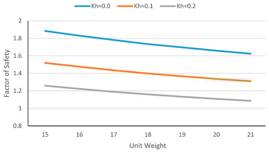 Figure 16, Figure 17 and Figure 18 depict the minimum FOS for various values of Kh (i.e., Kh = 0.0, Kh = 0.1, and Kh = 0.2) when the soil’s friction angle, cohesion, and unit weight all change within their reasonable boundaries. As seen in Figure 16 and Figure 17, as the soil’s friction angle and cohesion increase, the slope’s FOS will also increase. However, as presented in Figure 18, the relationship between FOS and unit weight is reversed, as expected. In addition, as illustrated in these figures, compared to Kh = 0.0, Kh = 0.1 results in an average 19% reduction in FOS. Moreover, when compared to the zero value of Kh, the decrement in FOS for Kh equal to 0.2 is almost 32 percent.