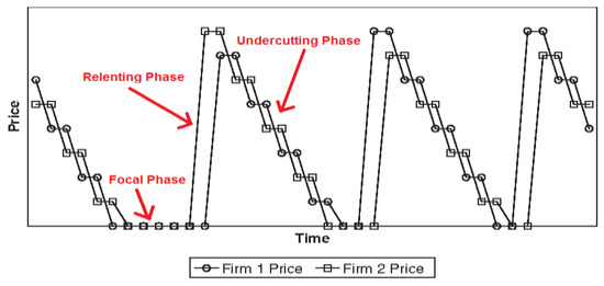 Maskin and Tirole assumed that a price cycle exists in a market with two firms that sell a homogeneous product. Figure 2 shows an example of the Edgeworth price cycle when two firms in a market sell a homogeneous product. In the Edgeworth cycle, firms consecutively undercut one another by offering goods at a lower price than their rivals to gain the market share until the price reaches marginal costs. At this point, one firm increases its price, and other firms follow it, and the undercutting phase starts again. Maskin and Tirole determined that firms with an Edgeworth price cycle follow three main predictions of the theory, which are as follows: (1) the reaction of firms is fast, but not simultaneous; (2) small-sized companies tend to lead in decreasing prices in the undercutting phase; and (3) large companies are more interested in being leaders in increasing prices in the relenting phase [10].