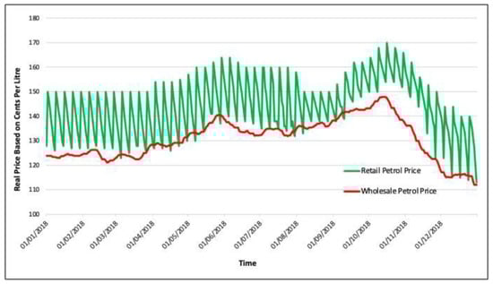 Figure 3. The time-series patterns of the average wholesale and retail petrol prices in Perth, 2018. Source of data: FuelWatch [1] and the Australian Institute of petroleum (AIP) [16].