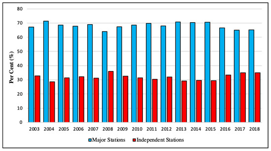 Figure 4. The market share of the major and independent stations, Perth, 2003–2018. Source of data: FuelWatch [1].