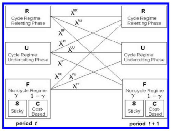 In Equation (12), λstRU shows the switching probability from the relenting to undercutting phase. Figure 5 shows nine switching probabilities of the Edgeworth cycle. Each large box depicts the undercutting, relenting, and focal regimes and the small boxes show the sub-regimes (cost-based or sticky prices). The switching probability out of regime i in time (t − 1) into regime j in time t, is presented by λij. Additionally, γ   i shows the probability of sticky prices conditional on regime i. The parameters βi, θi, ζi, and σi for each specification are estimated by the maximum likelihood.