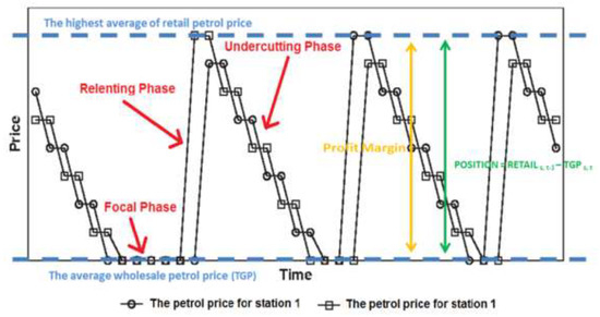 The cyclical pattern of petrol price is very similar in appearance to the Edgeworth cycle introduced by Maskin and Tirole [7]. The context of a dynamic, competitive, and asymmetric cycle goes back to Edgeworth [8], who argued that prices in a competitive market would not be stable based on the Bertrand model [9], and that they would change continually along a price cycle [10]. The seminal theory paper on Edgeworth cycles was by Maskin and Tirole, who provided game-theoretical foundations for the Edgeworth theory. Later extensions on the Edgeworth theory were undertaken by Eckert [11] and Noel [12]. They considered a dynamic price-setting game under the condition that two equal-sized firms sell homogeneous products under constant demand. They also assumed that firms were restricted to using Markov strategies, which means that one firm’s pricing decision depends on the pricing of another firm [13]. Their approach demonstrates the probability of two possible types of price setting under Markov equilibrium: the first illustrates the price stickiness over time, while the second shows asymmetric price cycles [14].