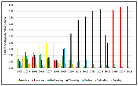 In 2003, Monday was the most expensive day to buy petrol (32% of relenting phases happened on Monday), while Saturday (29%) was the cheapest day in Perth. Peak days in 2004 and 2005 were Tuesdays and Wednesdays. From 2006 to 2008, Mondays were the most expensive days for petrol two years in a row. The cheapest day was Saturday in 2003. From 2004 to 2008, Sunday was the lowest day for purchasing petrol for five consecutive years. However, the role of days was not significant, and there was no specific peak day or trough day in the cycle from 2003 to 2010. Since November 2010, when petrol stations raised their prices on Thursdays, the role of days has changed dramatically. For about five years (2010–2015), Perth experienced a frequent and predictable weekly cycle where Thursday was the most expensive day of the week, and Wednesday was the cheapest.