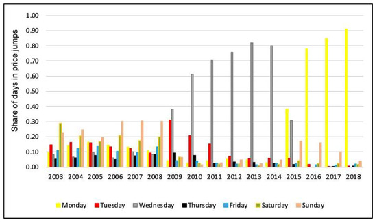 In 2015, the role of days changed again. In May–June 2015, the cycle was disrupted for two weeks. At the end of May (21 May), most Caltex stations abruptly broke the cycle pattern and ceased increasing their prices on Thursday (28 May). With effect from 2 June, Caltex stations established new peak and trough days in the cycle, where Tuesday was the most expensive day of the week, and Monday was the cheapest. After a few weeks, other brands followed Caltex’s lead by increasing their prices on Tuesdays. Therefore, from June 2015 to 2018, Monday was the cheapest day, and Tuesday was the peak day. The role of Monday as the cheapest day for buying petrol has been very significant in recent years. As shown in Table 9, Perth had 78% of trough days on Monday in 2016, and this reached 91% in 2018. The research shows that petrol prices have been more predictable since 2009. As a result, consumers can buy petrol at the lowest price on Monday and save a significant portion of their income in comparison to the years before 2009.