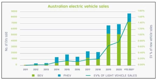 Figure 9. The sale of Australian electric vehicles, 2011–2021 [67].